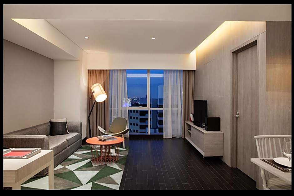 This fully-furnished apartment has a separate living, dining and kitchen areas. It's fitted with a home entertainment system and a well-equipped kitchen with built-in electric stove.